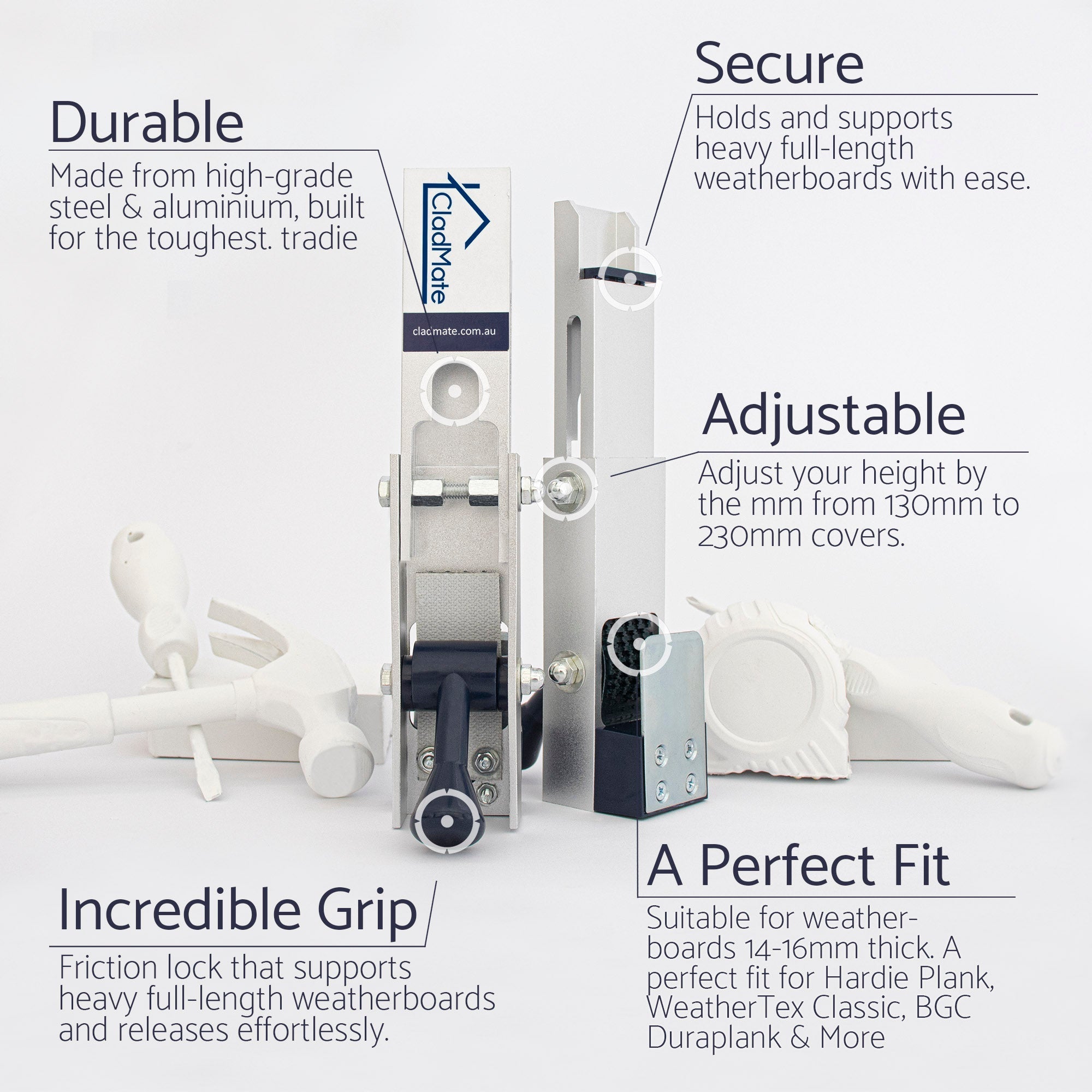 CladMate Classic acts as your second set of hands to securely support heavy full-length weatherboards, minimising installation time and producing excellent results board after board.